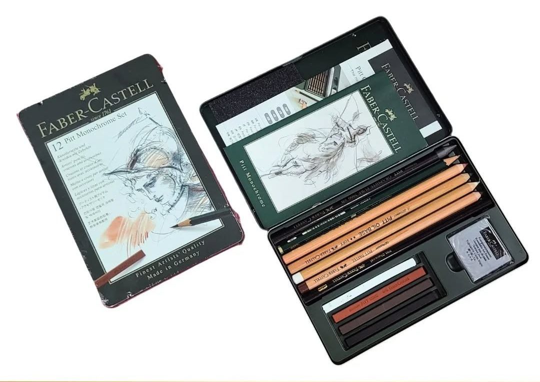 Juego de lápices Pitt Monochrome. Diseñado para el artista móvil, este práctico set portátil es ideal para bocetos y estudios en cualquier lugar. Incluye una selección premium de carboncillos, lápices de grafito, lápices artísticos y crayones de alta calidad, todo en un estuche compacto y fácil de llevar. Un set completo para artistas, ilustradores y estudiantes que buscan versatilidad y calidad profesional en un formato compacto.
